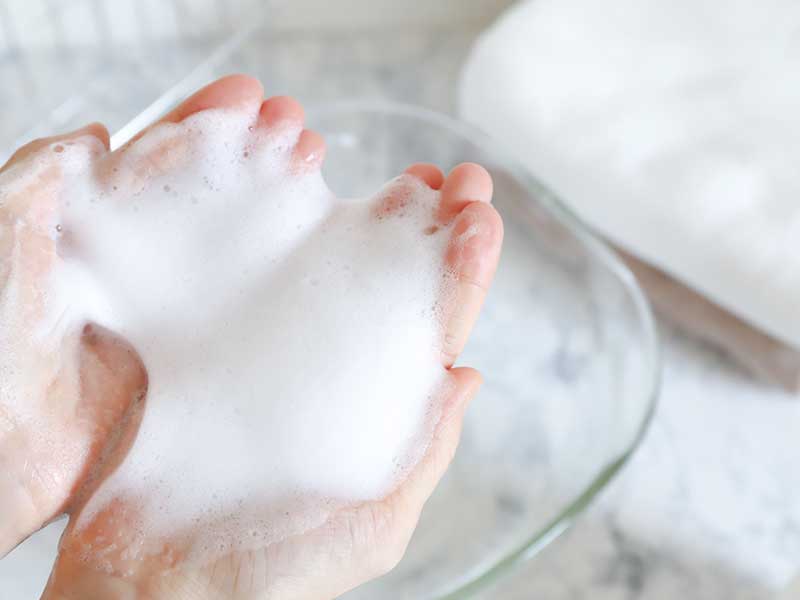 皮脂分泌が少ない季節ですのでこまめな洗顔は不要です。優しく泡立ててこすらないように洗いましょう。